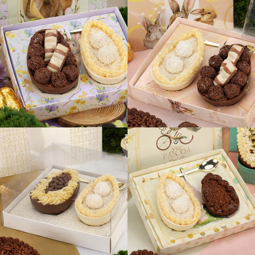 Feita para valorizar e proteger dois ovos recheados, oferecendo uma apresentação elegante e organizada.