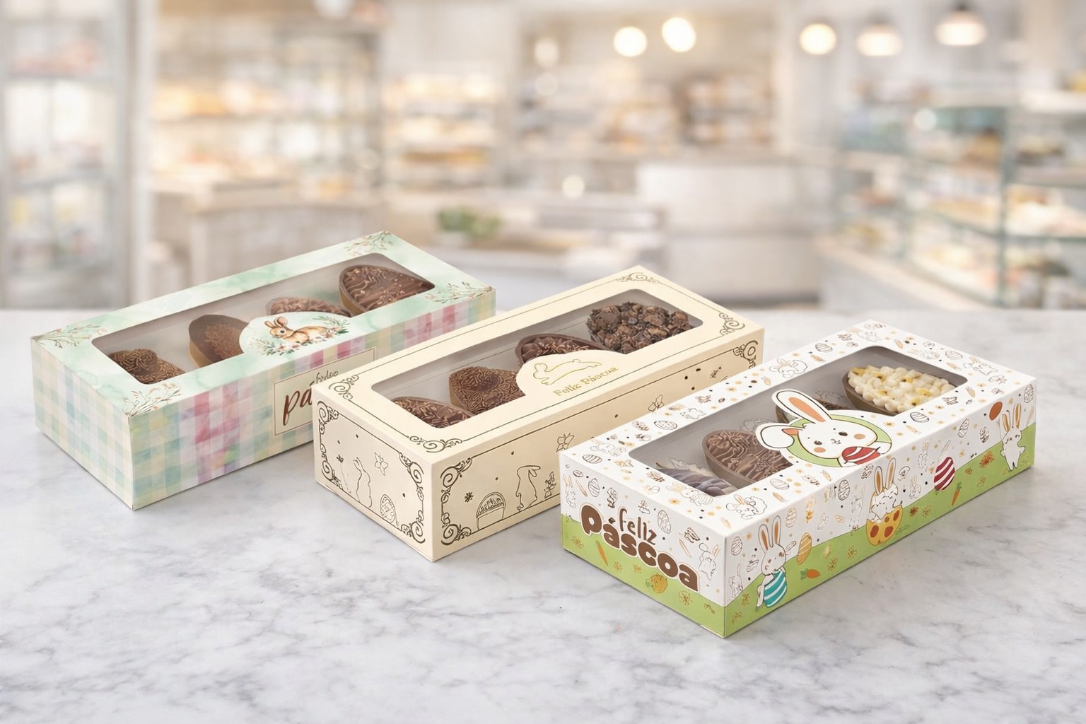 A Caixa Gaveta 4 Mini Ovos, une criatividade e versatilidade. Com ilustrações para pintar e visor transparente, é ideal para presentes personalizados. O produto acompanha um berço versátil, que permite escolher entre duas opções de montagem: acomodar quatro mini ovos de 50g ou um coelho de chocolate, perfeito para a forma BWB 10610. Basta escolher a forma que melhor combina com sua produção.