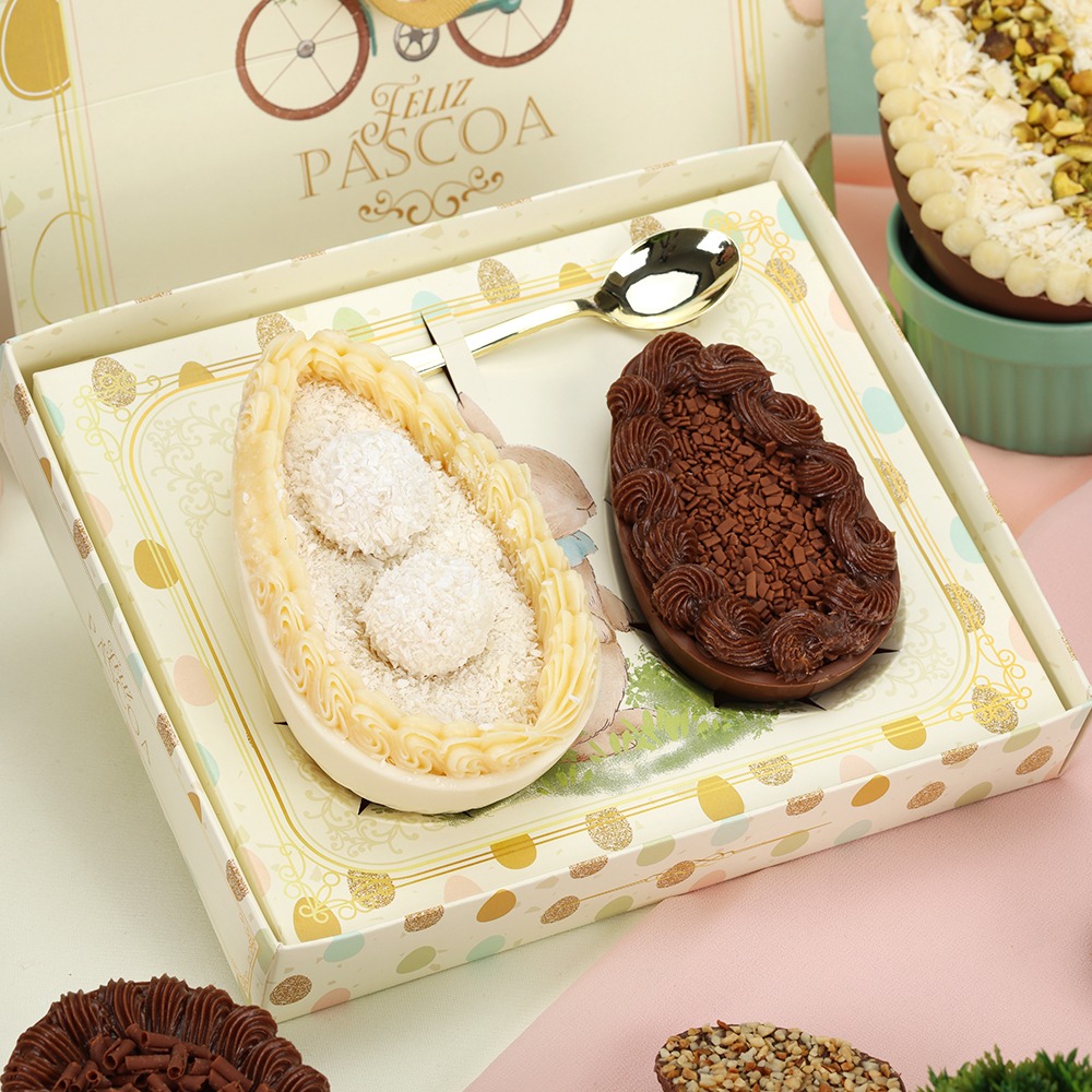 Feita para valorizar e proteger dois ovos recheados, oferecendo uma apresentação elegante e organizada.