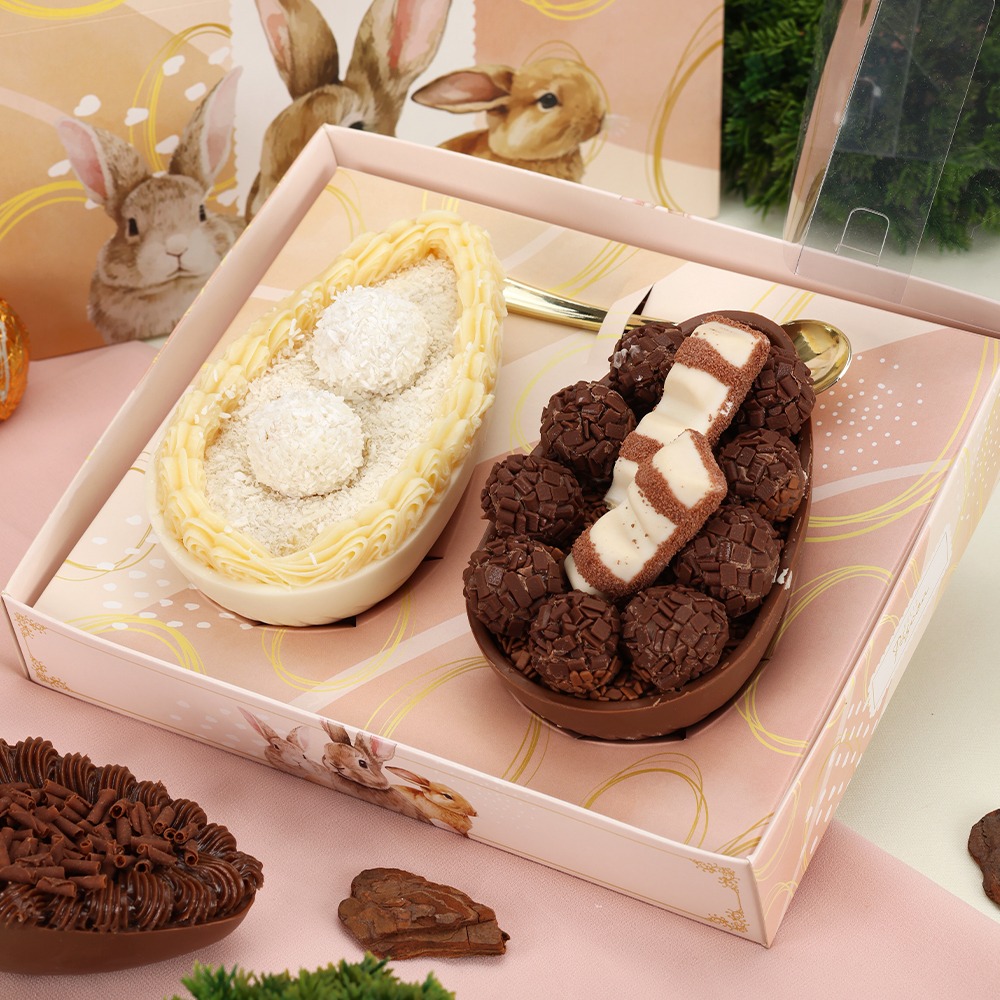 Feita para valorizar e proteger dois ovos recheados, oferecendo uma apresentação elegante e organizada.