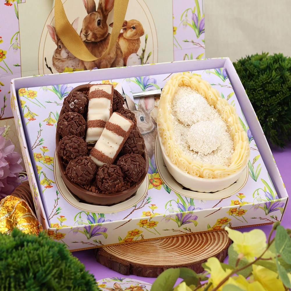 Feita para valorizar e proteger dois ovos recheados, oferecendo uma apresentação elegante e organizada.