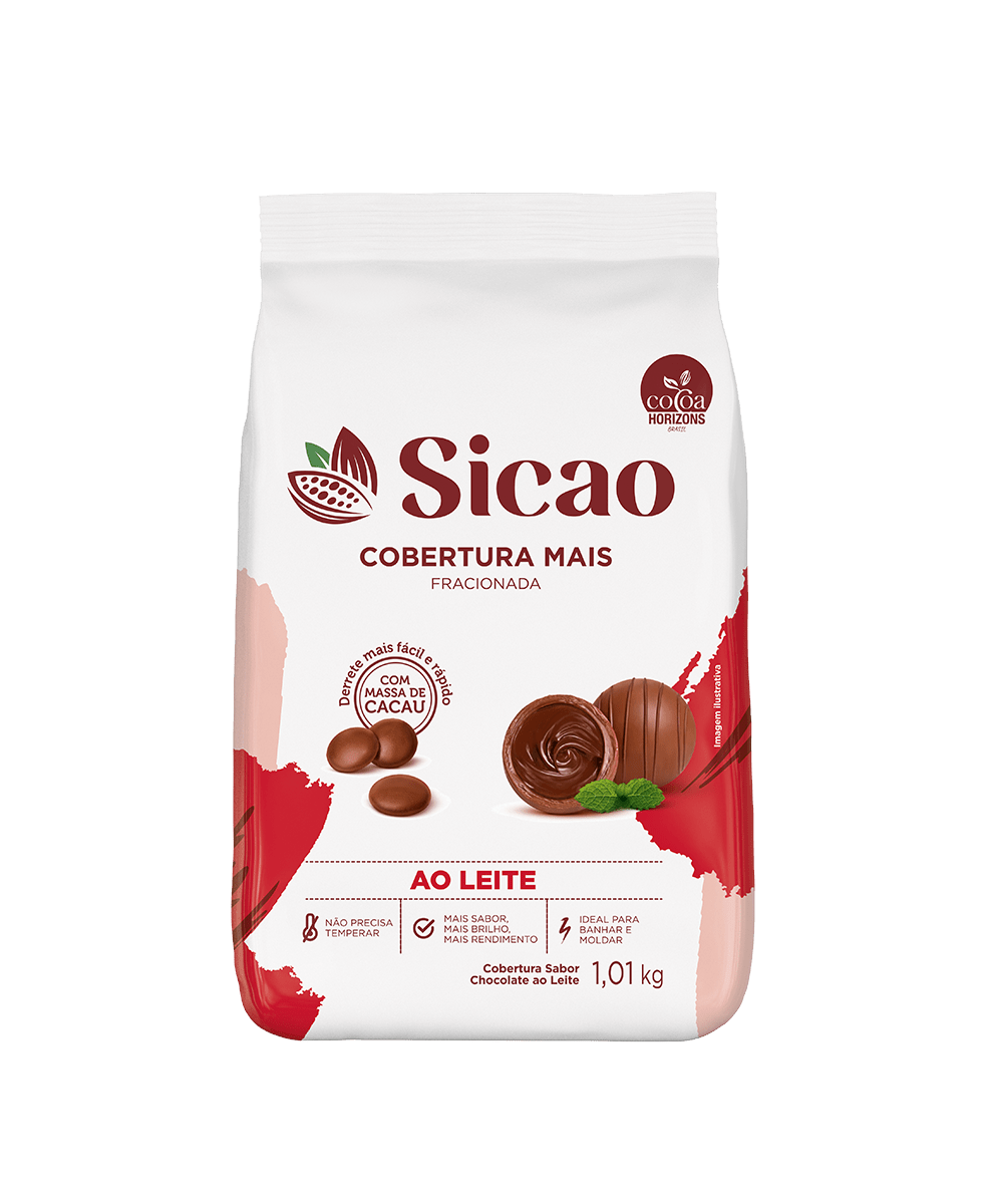 Mais sabor, mais rendimento. A Cobertura Sicao Mais traz o verdadeiro sabor do chocolate, contém liquor de cacau em sua formulação, e a presença de leite a torna mais cremosa. Tem excelente fluidez, brilho marcante e o melhor rendimento do mercado.