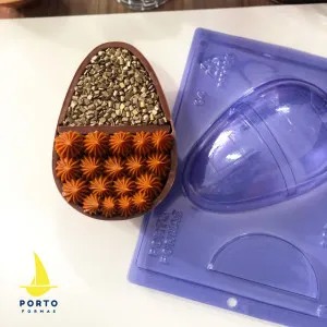Forma especial com silicone (3 partes), ideal para produção de chocolates com muito mais praticidade e precisão. Possui uma “marquinha” indicando a quantidade necessária de chocolate, levando para geladeira uma única vez. Ela proporciona uma casca uniforme e um acabamento perfeito sempre com o mesmo peso.
