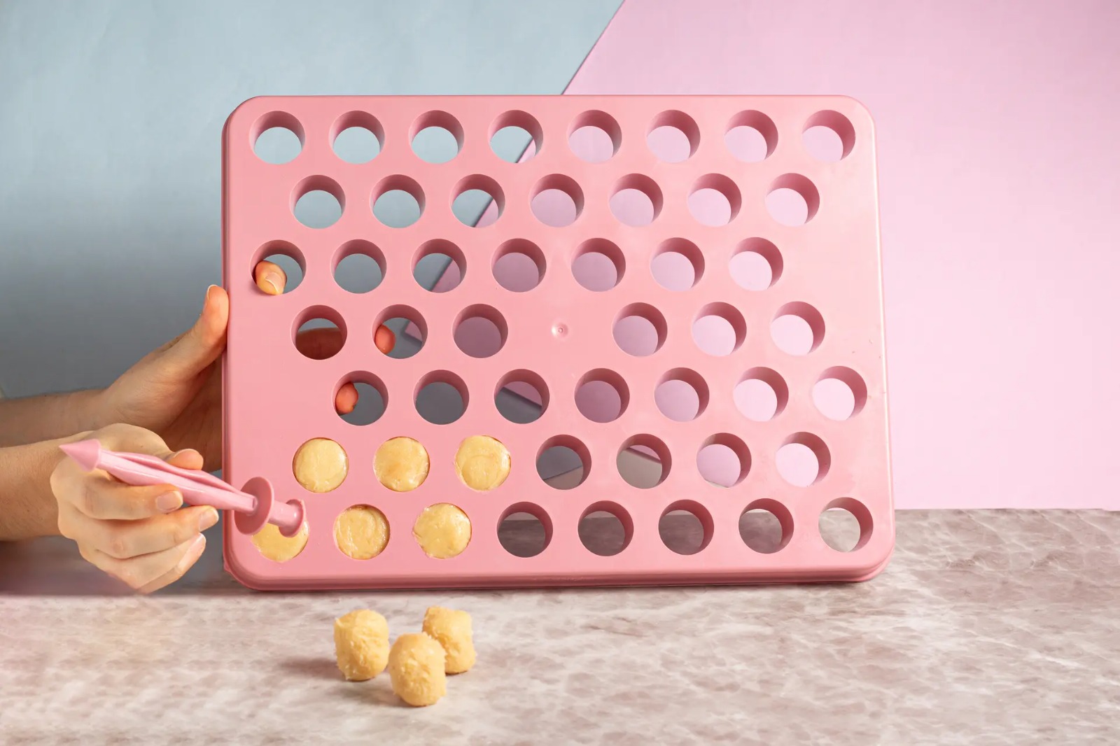 Acompanha um Empurrador 2em1, onde uma ponta empurra os doces e a outra possui uma Esteca para perfurar os brigadeiros e recheá-los