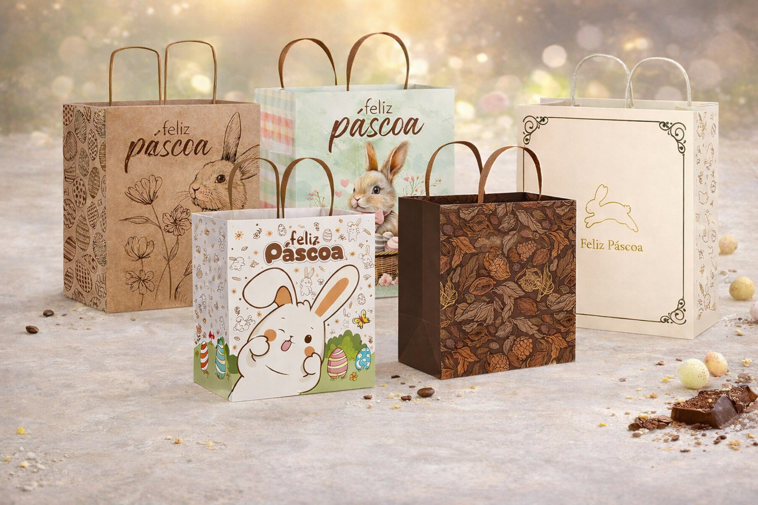 A Sacola M é elegante e funcional. Com estrutura firme e alças reforçadas, é ideal para transportar presentes e kits de Páscoa.