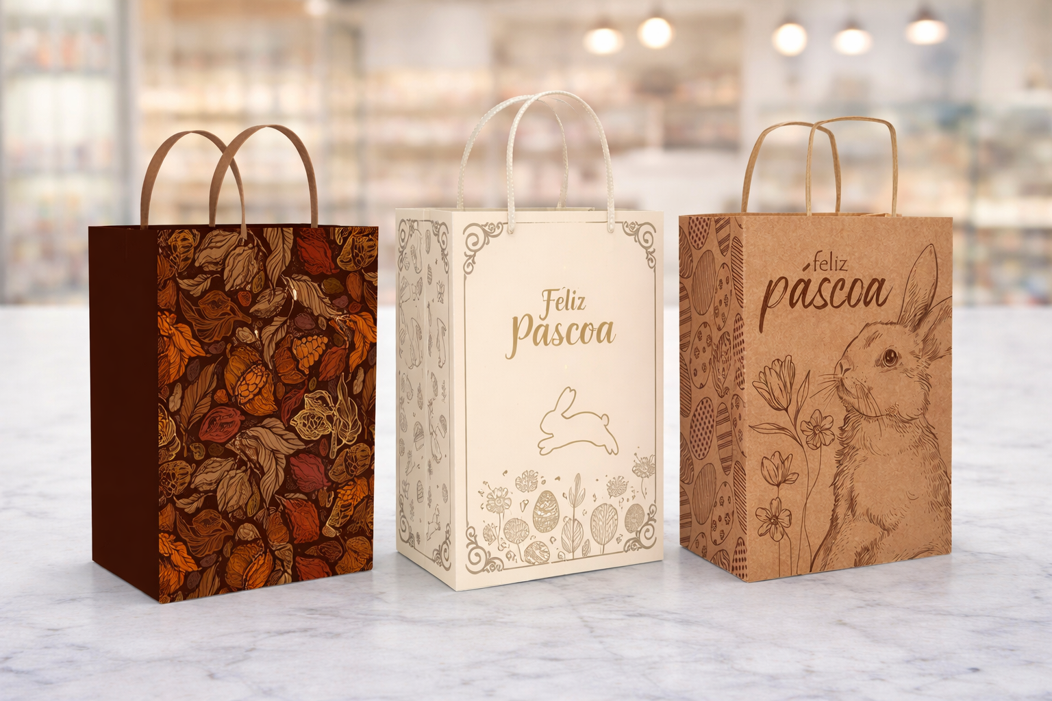 A Sacola P é elegante e funcional. Com estrutura firme e alças reforçadas, é ideal para transportar presentes e kits de Páscoa.